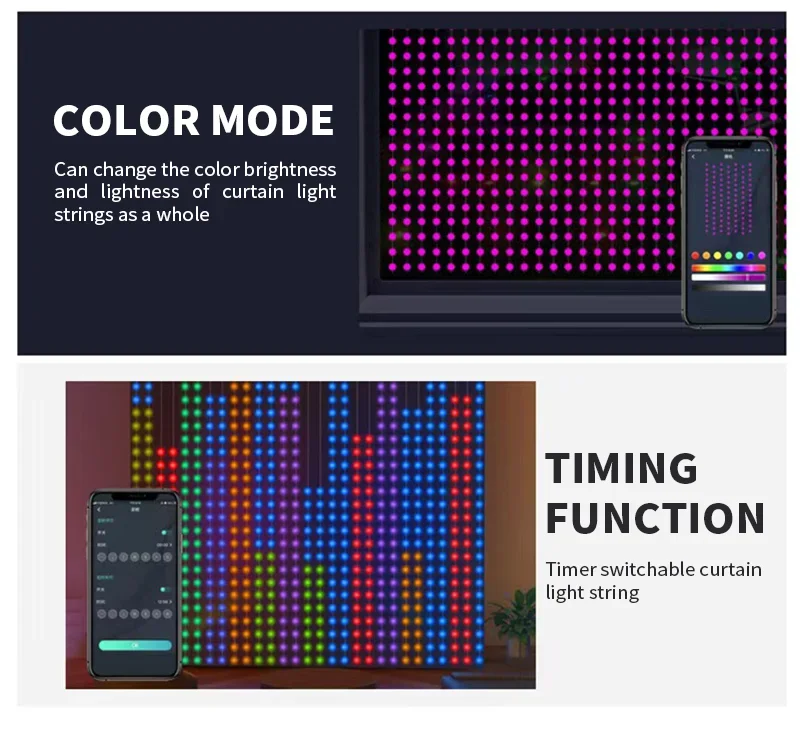 The RGB led curtain lights waterproof grade IP65 (Note: Controller and adapter are non-waterproof, please seal them for external use). Twinkle string lights utilize LED bulbs, eliminating the need for open flames and reducing heat emission. They are safer and more reliable compared to traditional indoor fairy lights, minimizing the risk of fire hazards, making them particularly suitable for prolonged use or in environments with children or pets